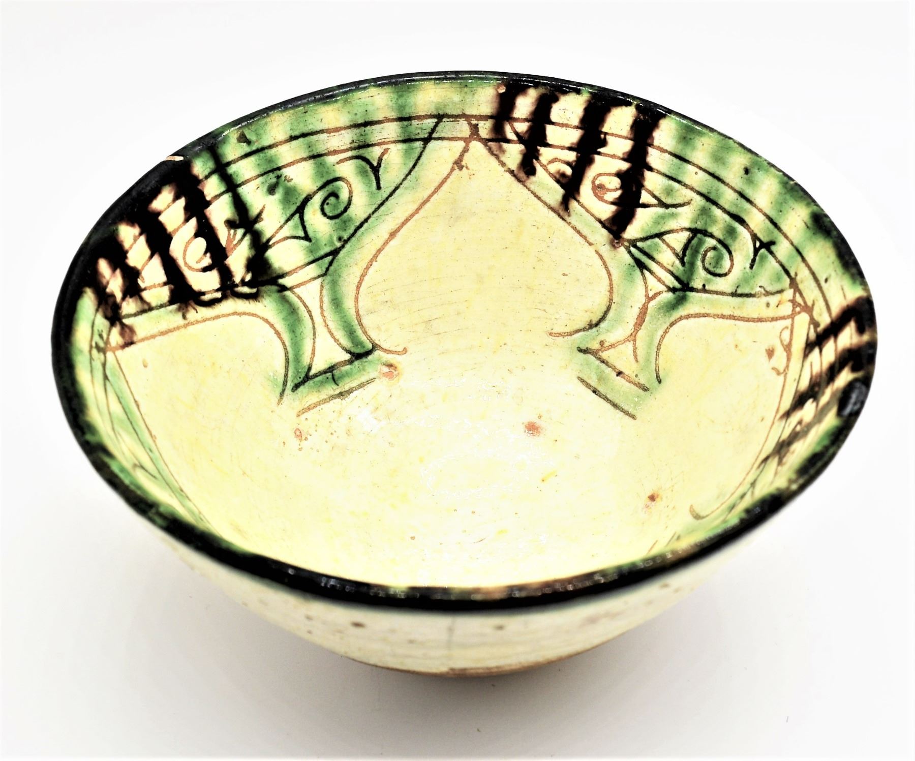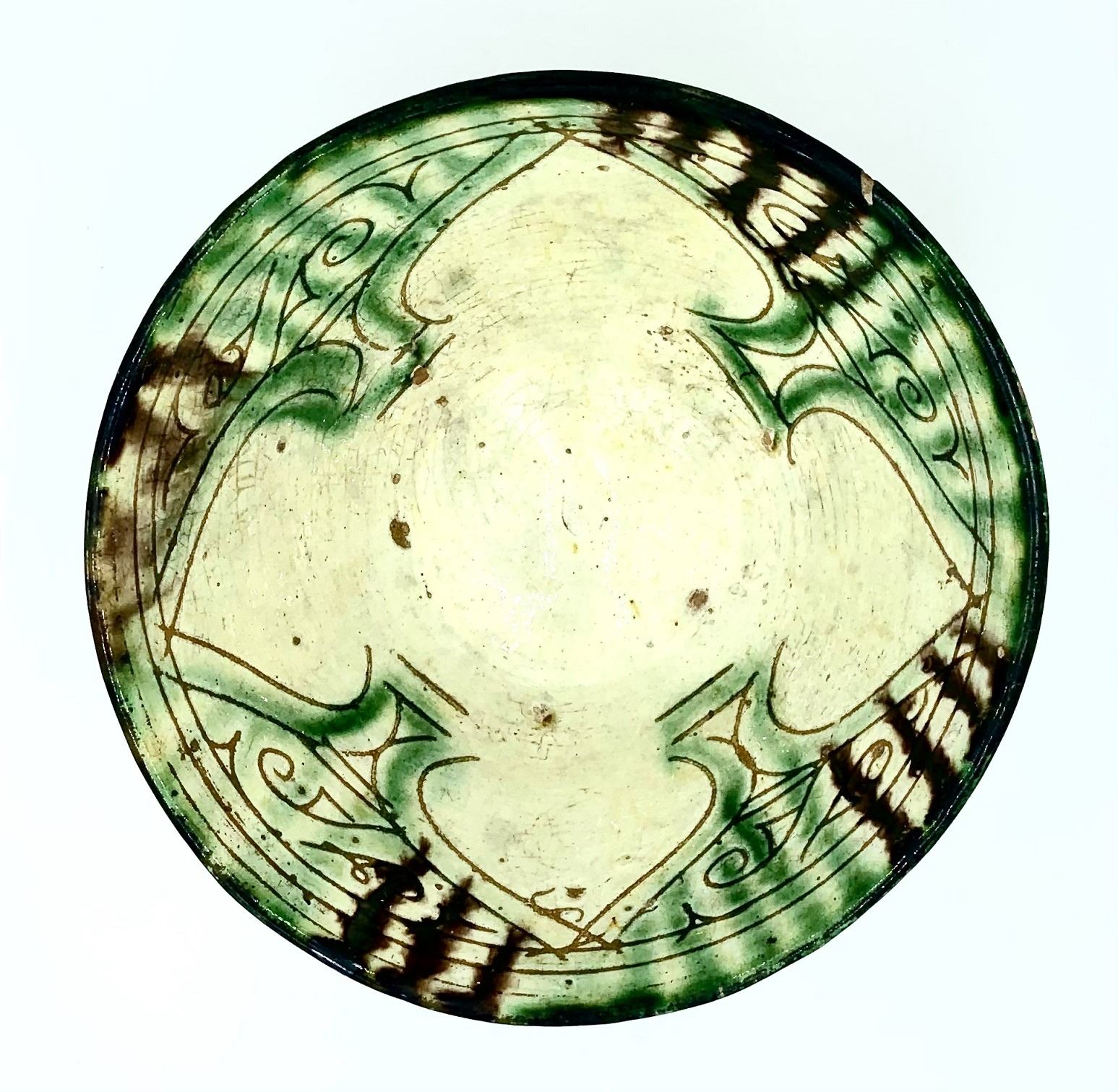 INTERESTING INATACT ISLAMIC SELJUK/GHURID HEART SHAPED SGRAFFIATO POTTERY BOWL, BAMIYAN CIRCA 12TH CENTURY.
