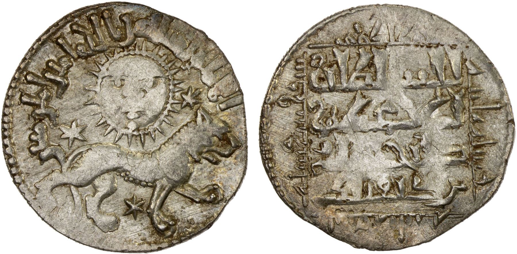 SELJUQ OF RUM: Kaykhusraw II, 1236-1245, AR dirham (2.99g), Sivas, AH639, A-1218, lion right, sunface above, with star left and right of sunface, some weakness, XF.