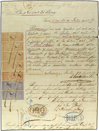 SELLOS FISCALES PARA GIRO 1867-98. Conjunto de 27 Documentos muchos con franqueos multiples. CONJUNTO ESPECTACULAR Y MUY RARO. A petición podemos enviar juego de fotocopias.