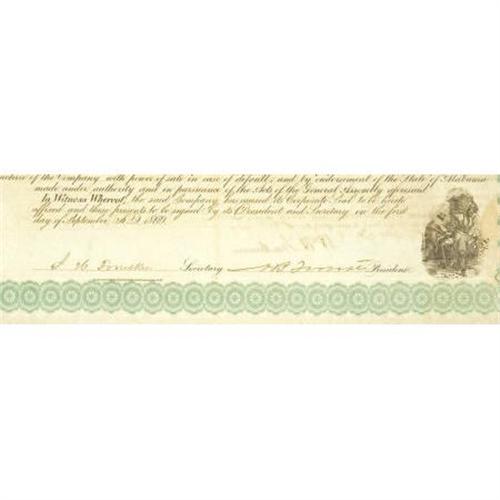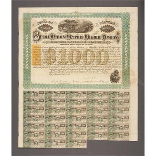 <B>SELMA, MARION AND MEMPHIS RR CO. BOND SIGNED BY N. B. FORREST 1867</B></I> - Very scarce post Civil War $1000 bond payable in Gold coin. Signed by <I>Nathan Bedford Forrest</B></I>, Two of the 35 $40 coupons have been paid. A beautiful bond depicting town scene of Steam locomotive pulling into Railroad depot, has gilded $1000. In middle of bond, lower bottom corner of bond there are African Americans picking and hauling cotton. Would make a very nice framed wall item. <BR><BR><B>Condition:</B></I> Fine, paper creases from being folded<BR><BR><BR><b>Shipping:</b> Flat Material, Small (<a target="_blank" href="http://www.heritageauctions.com/common/shipping.php">view shipping information</a>)