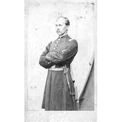 Great war-date, full standing with sword CDV of Bickford as 1st Lieutenant. He served in the Suffolk region of Virginia for 1862 through 1863. Backstamp by Warren, Lowell, Mass. Minor spotting, else very good.