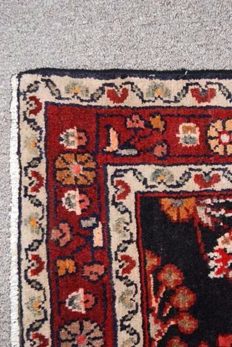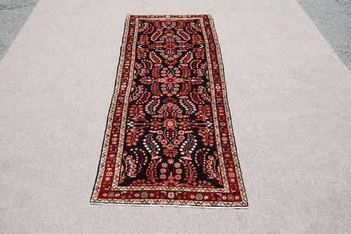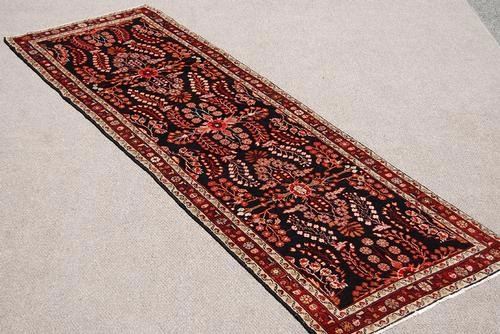 FINE QUALITY SEMI ANTIQUE HANDMADE PERSIAN HAMADAN. SIZE SIZE 3.6 X 11.2 FEET, MADE OF FINE QUALITY BABY LAMB'S WOOL PILE ON COTTON FOUNDATION, ALL NATURAL VEGETABLE DYE, A BEAUTIFUL REPEATED FLORAL MOTIF ON A BLACK AND RED BACKGROUND. WITH A ROW OF THREE CENTRAL MEDALLIONS AND INTRICATELY DONE GEOMETRIC BORDER. HAND WOVEN IN HAMADAN, Iran.