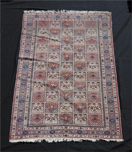 SEMI-ANTIQUE ORIENTAL RUG. Interesting garden style rug with eleven rows of five squares having alternate flower and bird designs. Three borders. Colors in blue, ivory and rose. SIZE: 57in. x 89in.. CONDITION: Very good. 9-26028