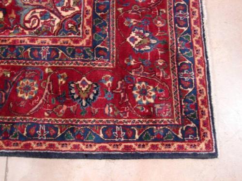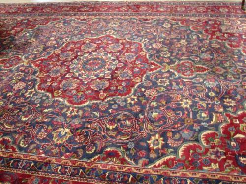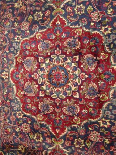 SEMI-ANTIQUE PERSIAN ROOM SIZE RUG. Decorated with maroon, navy blue, cream, pink, & green colors. 12.8’ x 9.7’