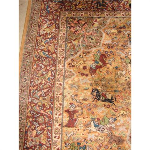 SEMI-ANTIQUE PERSIAN RUG. Decorated with tribal warriors and tan, brown, green, blue, gray, & rose colors. 12.11’ x 8.8’