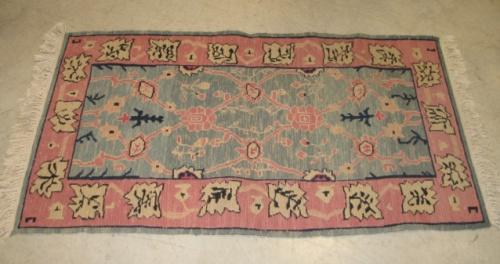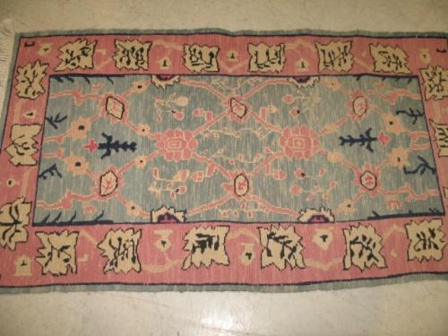 SEMI-ANTIQUE PERSIAN THROW RUG. Pink, blue, and green color. 54.5" x 30"