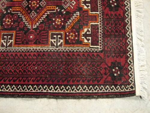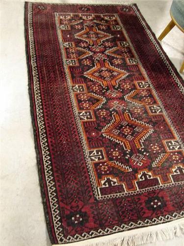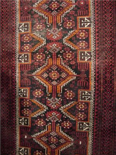 SEMI-ANTIQUE PERSIAN THROW RUG. Decorated with red, black, white, & orange colors. Shows wear at center. 6.6’ x 3.4’
