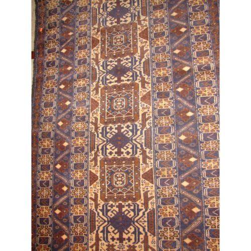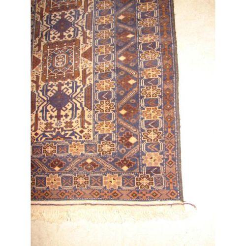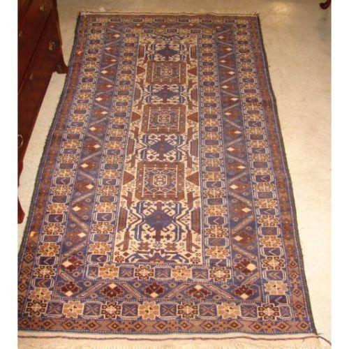 SEMI-ANTIQUE PERSIAN THROW RUG. Decorated with blue, tan, & brown colors. 83” x 43.5”