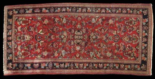 SEMI-ANTIQUE SAROUK CARPET. Middle of the 20th Century. Nice entryway size having a red field with center medallion and flower design. Colors of red, blue, ivory and green. SIZE: 12’5” x 5’2”. CONDITION: Very good. 9-27831