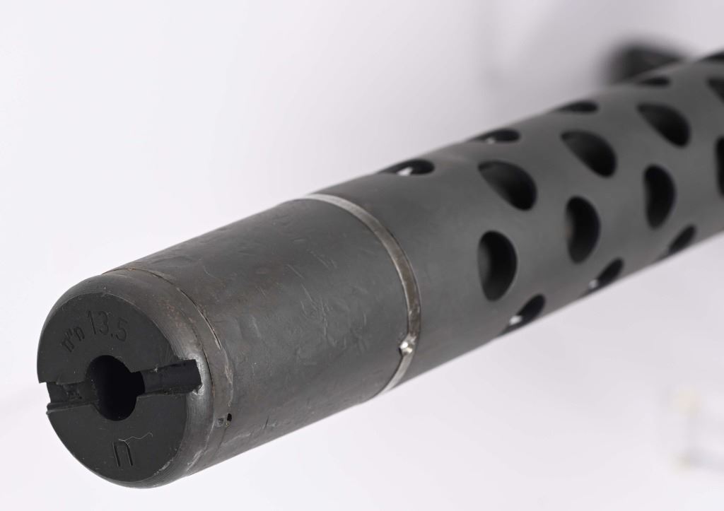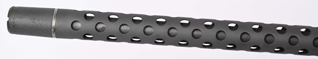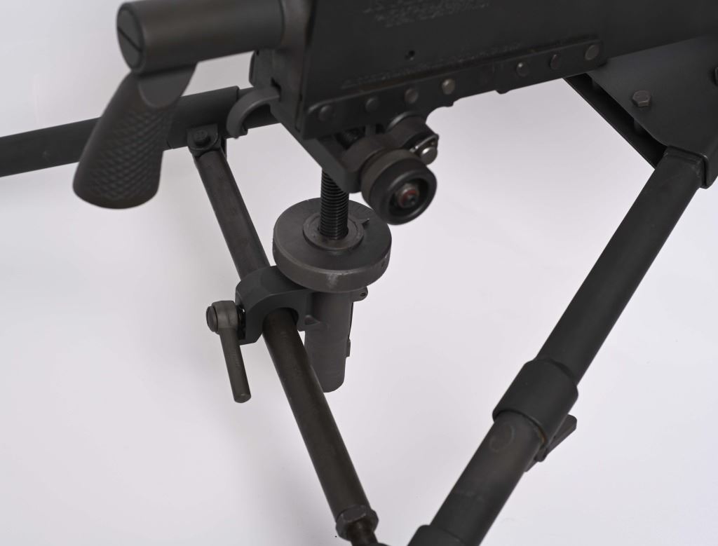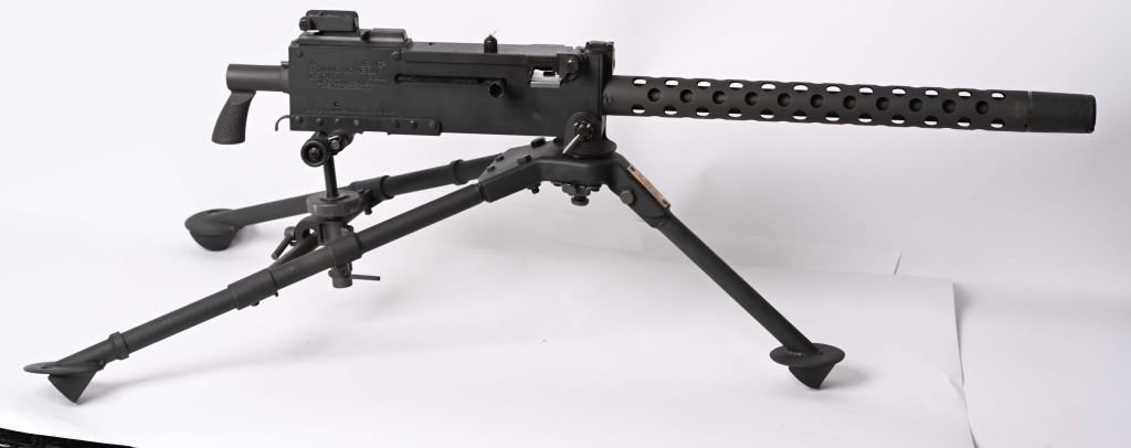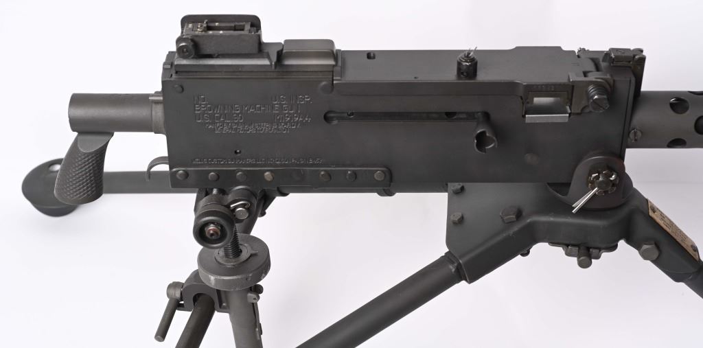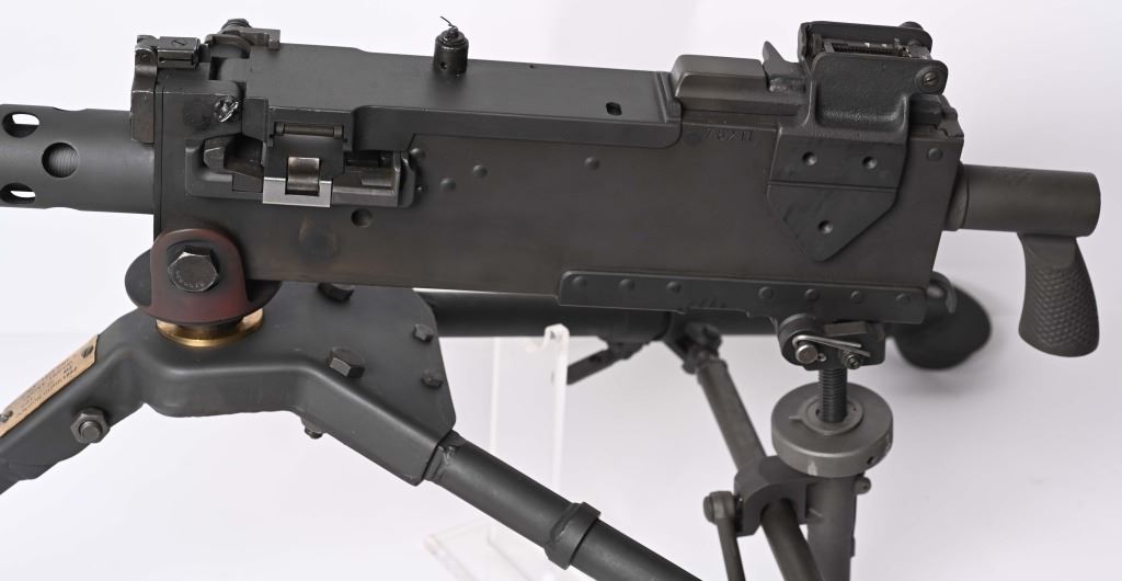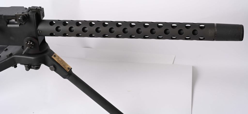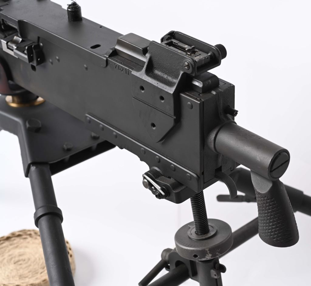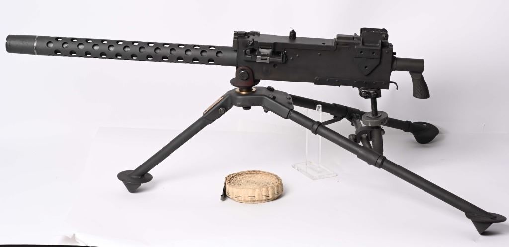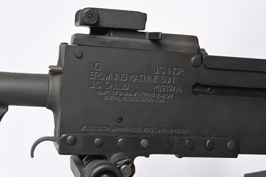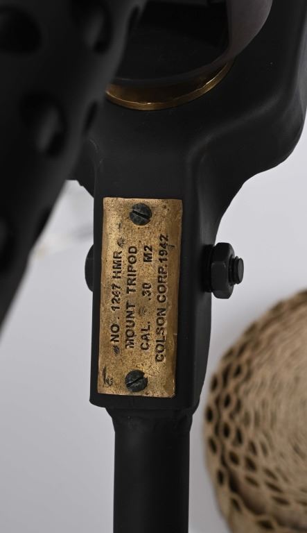 SERIAL NUMBER: B457. BARREL: 27". CALIBER: .308/7.62X51 NATO. MANUFACTURED: 2010'S. Built on an Israeli marked surplus kit by Wells Custom Gun Makers LLC. Mixed kit, with most parts looking to be Saginaw or RIA production. Right sight plate has recreated Saginaw type markings. "7.62" marked on the bolt, rear sight and left side plate. Newly applied parkerized finish. Attached are original pintle mount. Includes a 1942 Colson production M2 tripod mount, and a .30 caliber can with a parts pouch and 250 round cloth belt inside. CONDITION: Metal is excellent overall, with light handling marks. Bore is clean overall with strong rifling retained. Mount is very good with light wear. The spring is absent from the tripod mount. MODERN