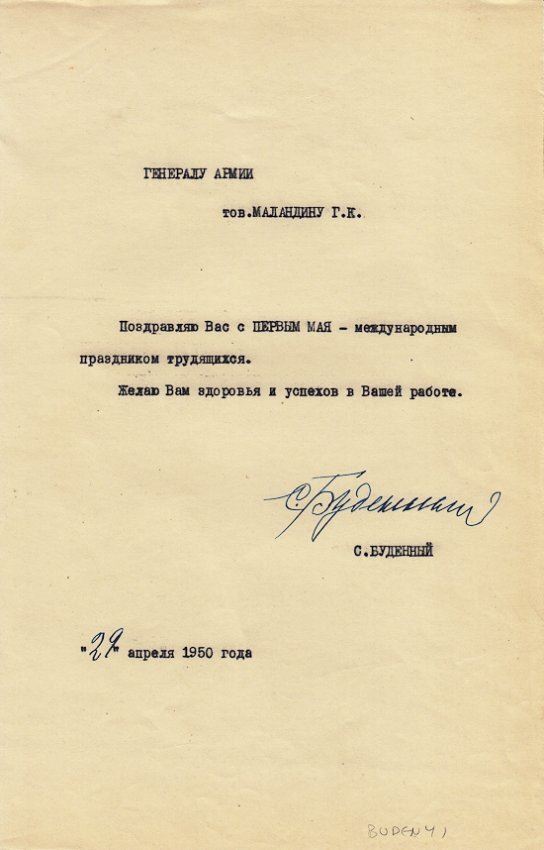 (1883 - 1973) Soviet field marshal and Commander in Chief of the Southwestern Front. An inept leader, Budenny allowed Von Rundstedt's army to divide and nearly destroy his command. Scarce T.L.S., 1p. 4to., April 29, 1950 in Russian, sending warm May Day greetings to a fellow general. Fine.