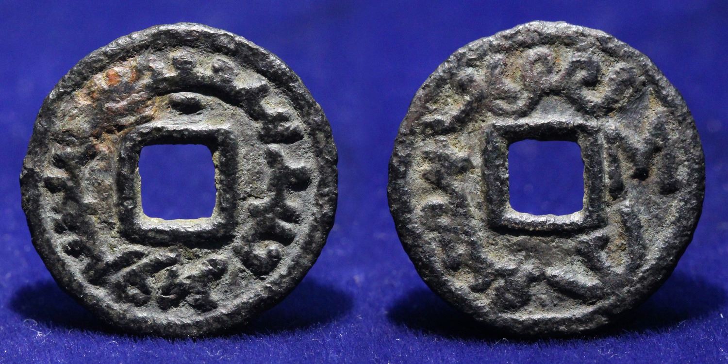 SEMIRECH'E: Qarluq: Qaghan Kobak, 8th century, AE cash, Sogdian text for the Qarluq branch of the Arslanids of Semirech'e (pny bgy xralwy xagan) // ruler's name, plus two Runic-style tamghas, almost no weakness. (1.55gm, 19mm) Near Extremely Fine and Extremely Rare.
