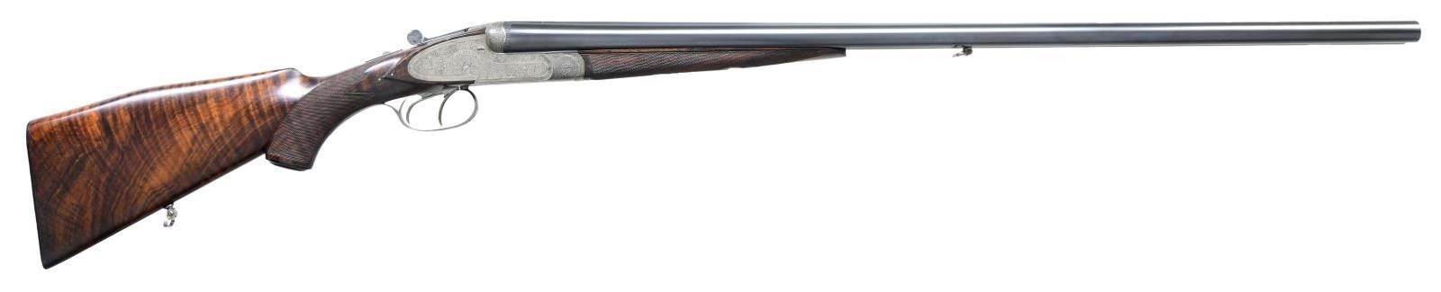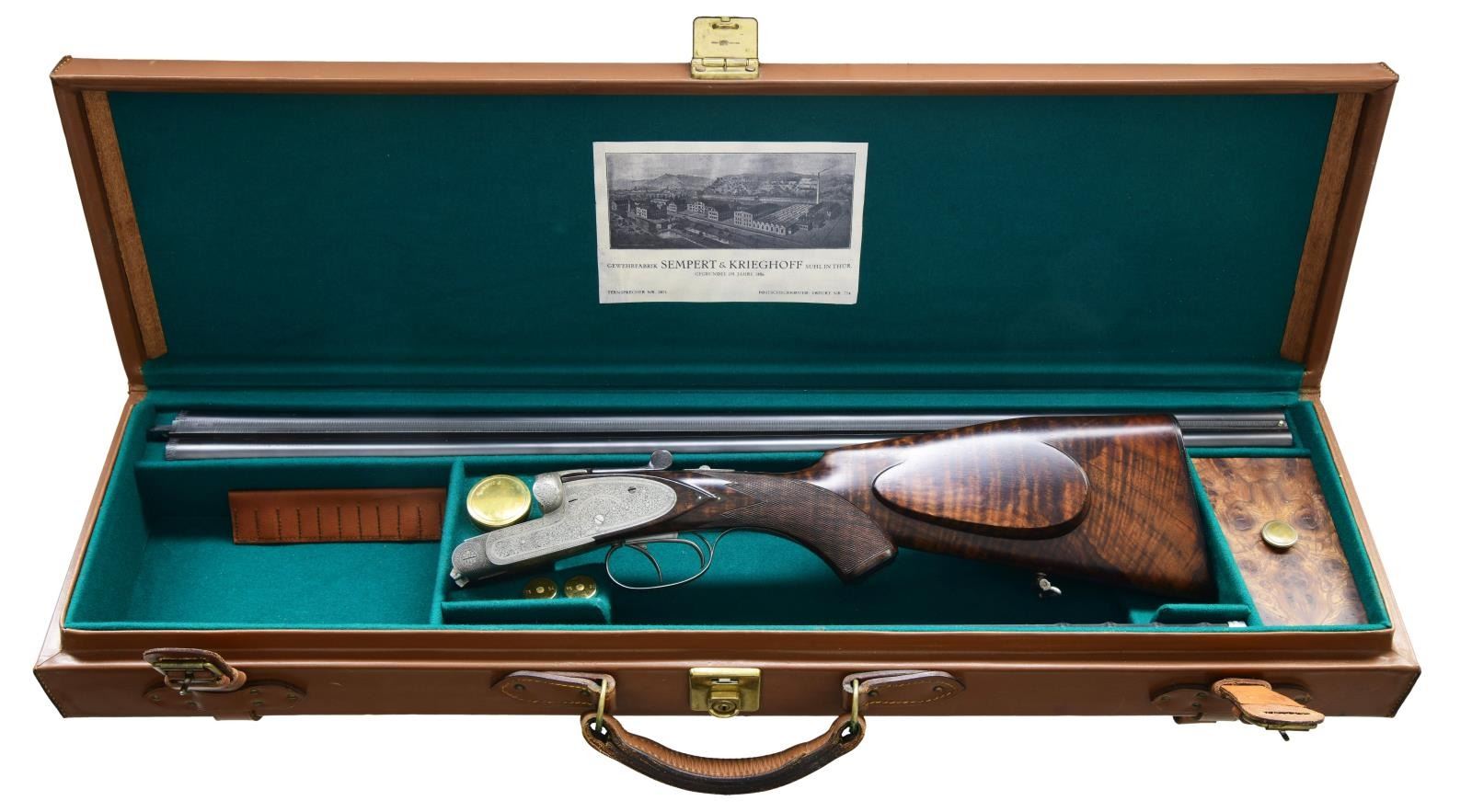 SHOTGUN. Cal. 16 ga. 2 9/16". S# 9570. Bbls. 29 1/2" w/ steel bead & nitro proofs. Sidelock action has full coverage of arabesque scroll engraving. Features include double underlug & crossbolt locking w/ side clips & cocking indicators. Selective ejectors. Double triggers, front trigger is articulated. Ebony tipped splinter forearm & Monte Carlo cheekpiece pistol grip stock & horn grip cap. LOP: 13 5/16" over grooved horn buttplate. DAC: 1 5/8". Drop at Monte Carlo: 2 1/4". DAH: 3 3/8". Bore diameter: R .670 L .669. Choke constriction: R .028 L .045. Minimum wall thickness: R .031 L .030. WEIGHT: 6 lbs, 14.2 oz. UNATTACHED ACCESSORIES: leather covered case w/ green fitted interior has added Sempert & Krieghoff label. Case contains 2 piece cleaning rod, snap caps, brass accessory bottle, oil bottle & cleaning accessories. Also included is a Sempert & Krieghoff catalogue reprint. Copy of "The Journal of the German Gun Collectors Association" no. 14 summer 2002 w/ an article titled "Krieghoff Guns, Now And Then". CONDITION: bbls. retain 95% blue. Action finish has faded to gray. Stocks have good finish & checkering showing a few small marks. Action is tight & on face w/ top lever sitting at center. Very good bright bores. (24-2172/DS). CURIO. $6,000-10,000.