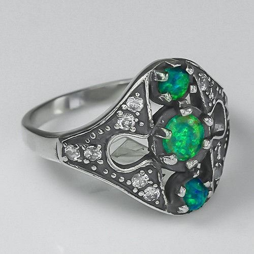 LOVELY 2.5 CT GREEN OPAL SOLIS SILVER RING. These Lab Created .Exceptional Multi Color Play Opals Are Set In Solid .925 Sterling Silver. Size 7. Total Gram Weight Is 3.8 or 20 cttw.