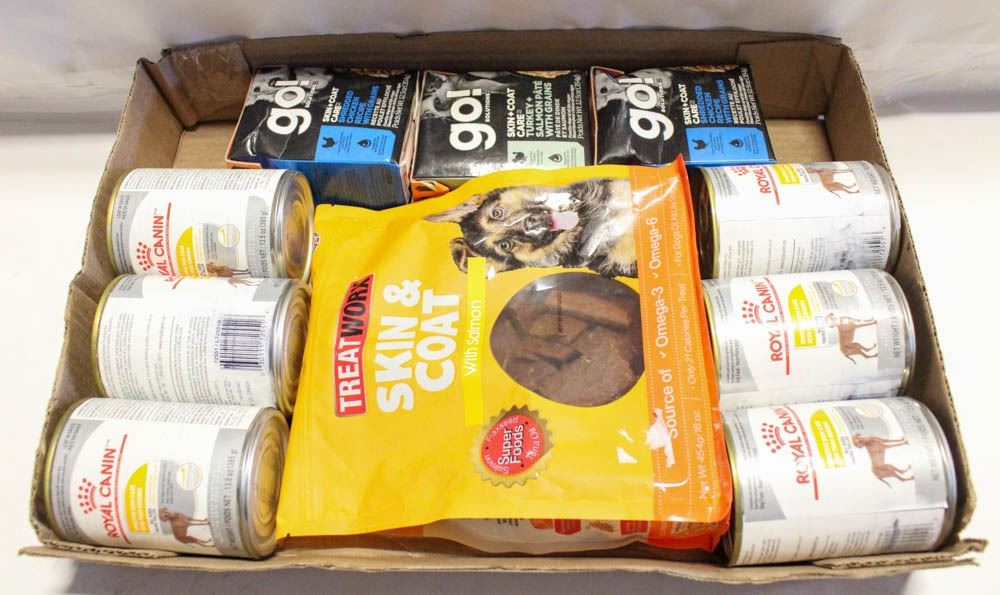 6 CANS ROYAL CANIN: SEP5/25 + 3 X354G PAKS GO! SOLUTIONS FOOD: FEB 2028 + 454G TREATWORX SALMON TREATS: SEP 27/25- RETAIL $72