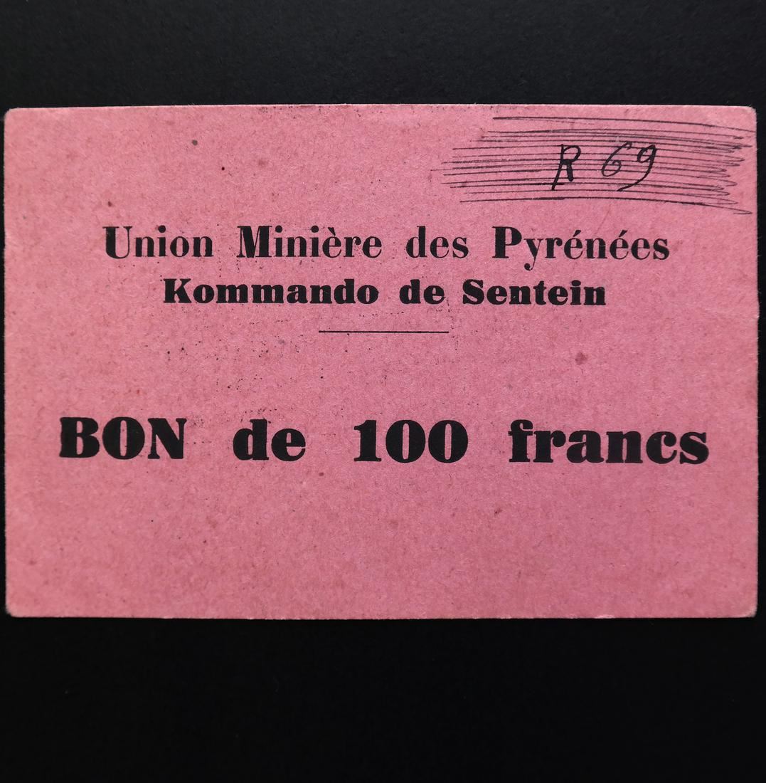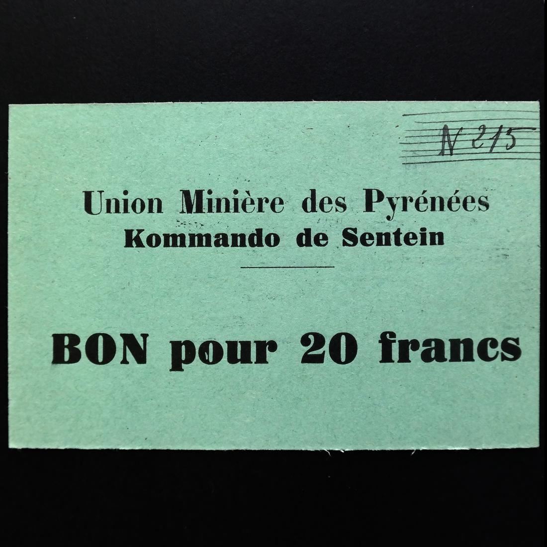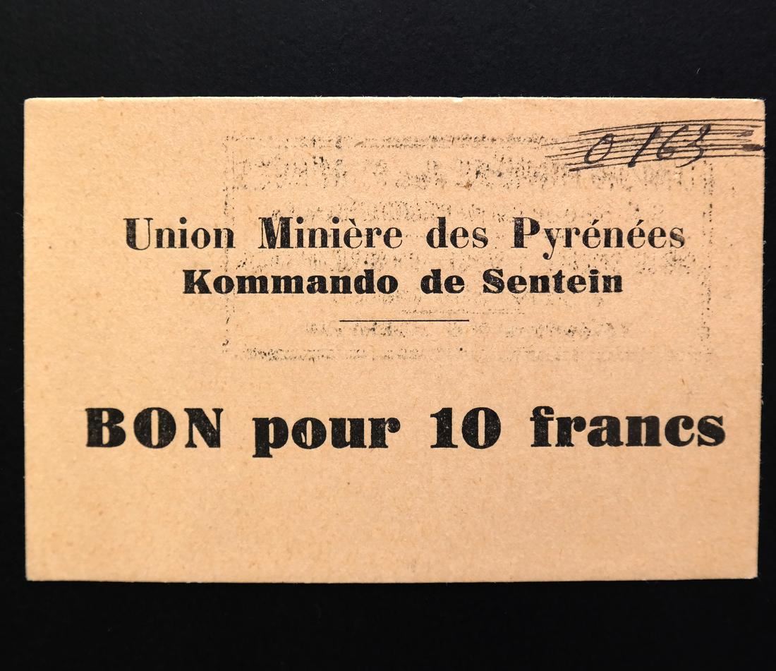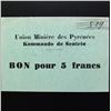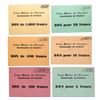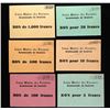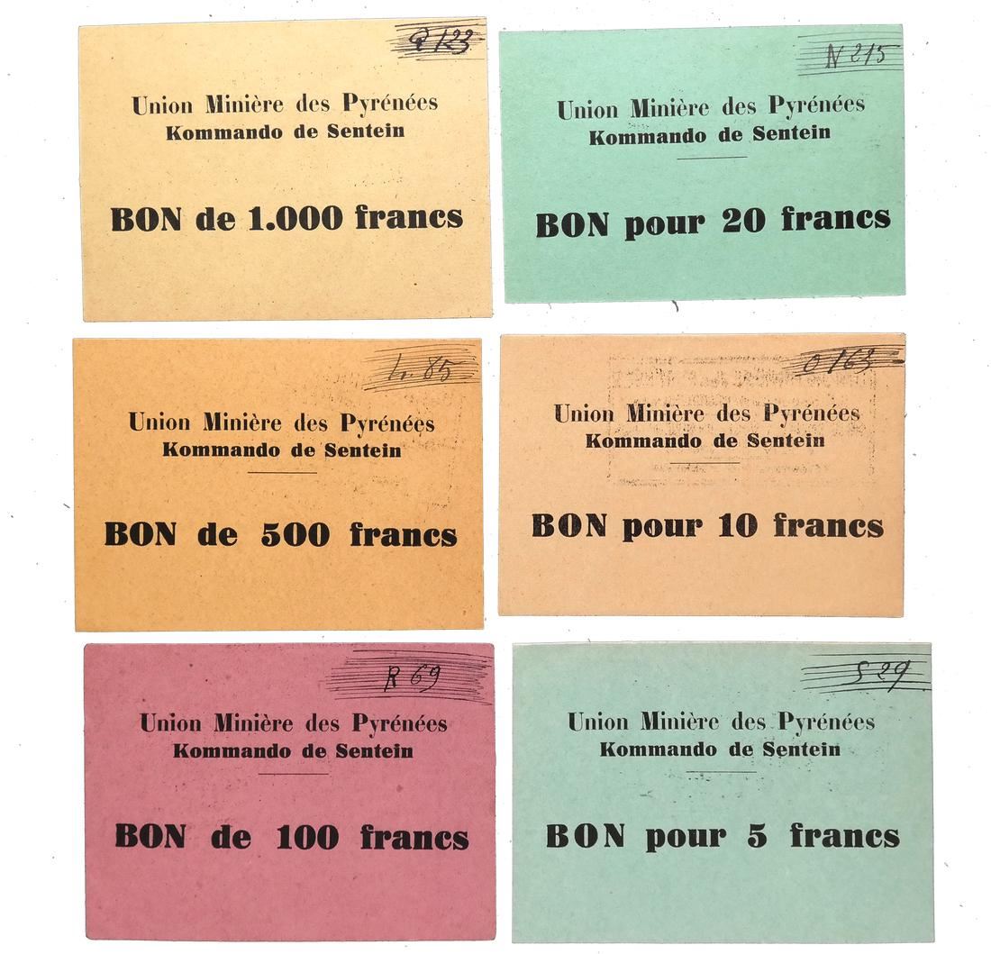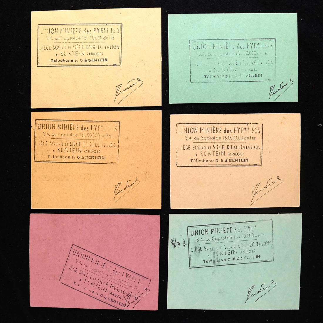 Union Minire des Pyrnes / Kommando de Sentein 5Fr, 10Fr, 20Fr, 100Fr, 500Fr and 1,000Fr on different colored card paper, each hand numbered on front, handstamped and signed on reverse, sound and XF.