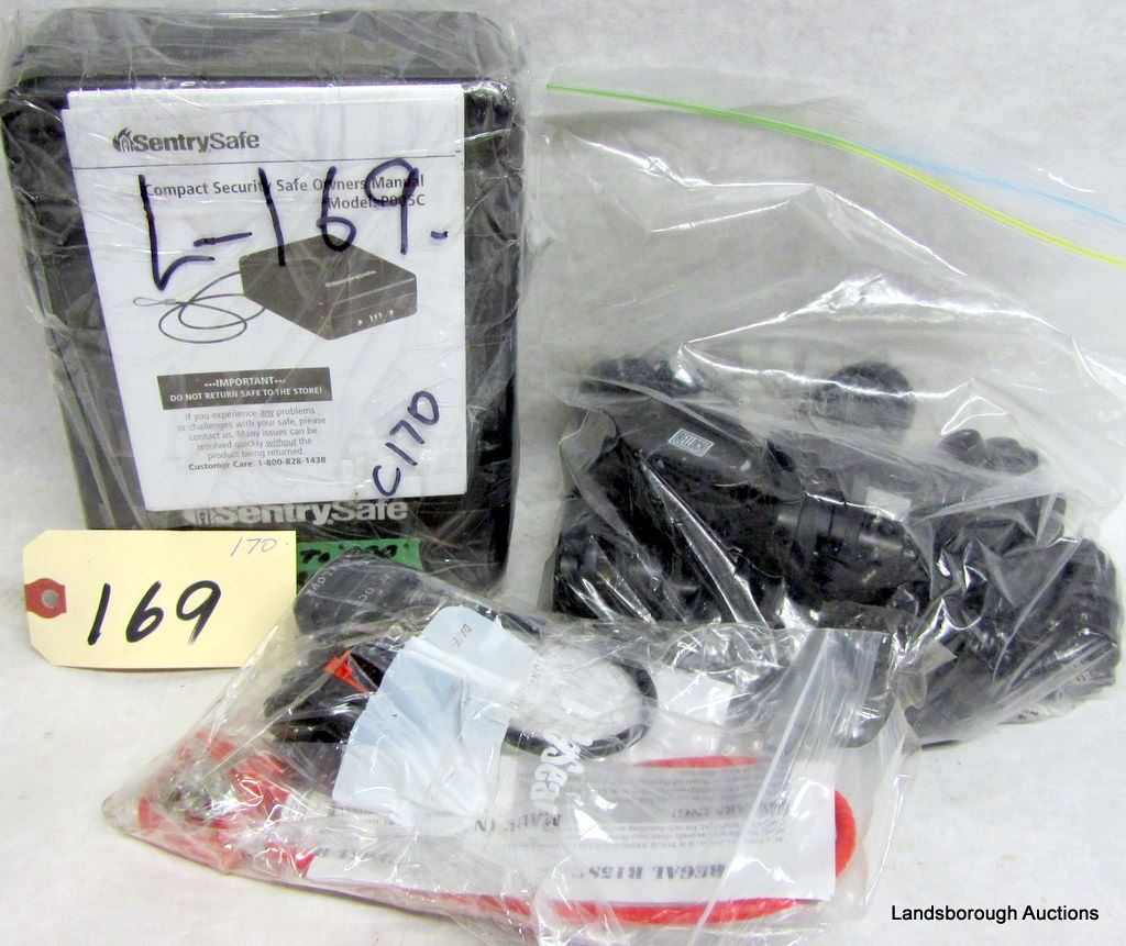 1 COMPACT SENTRYSAFE MODEL P005C & 13 COMBO LOCKS AND 1 KEYED TRIGGER LOCK AND 2 KEYED CABLE LOCKS.
