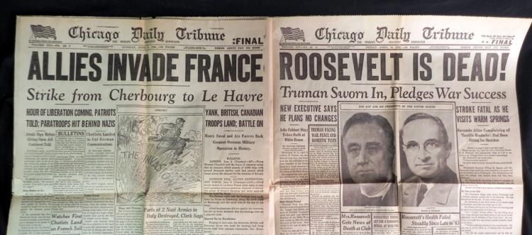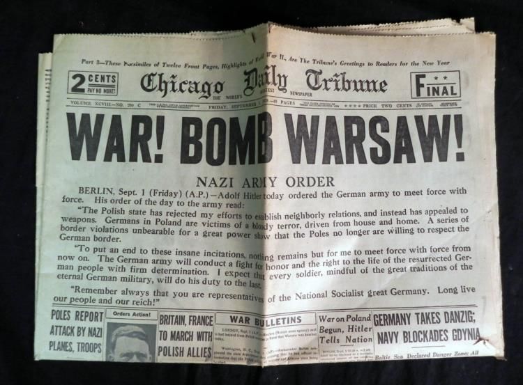 WAR-BOMB WARSAW-SEPT 1.1939-CHICAGO TRIBUNE HEADLINES+11 OTHER PAPER HEADLINES---WWII'S BEGINNING TO END HEADLINE FRONT PAGER