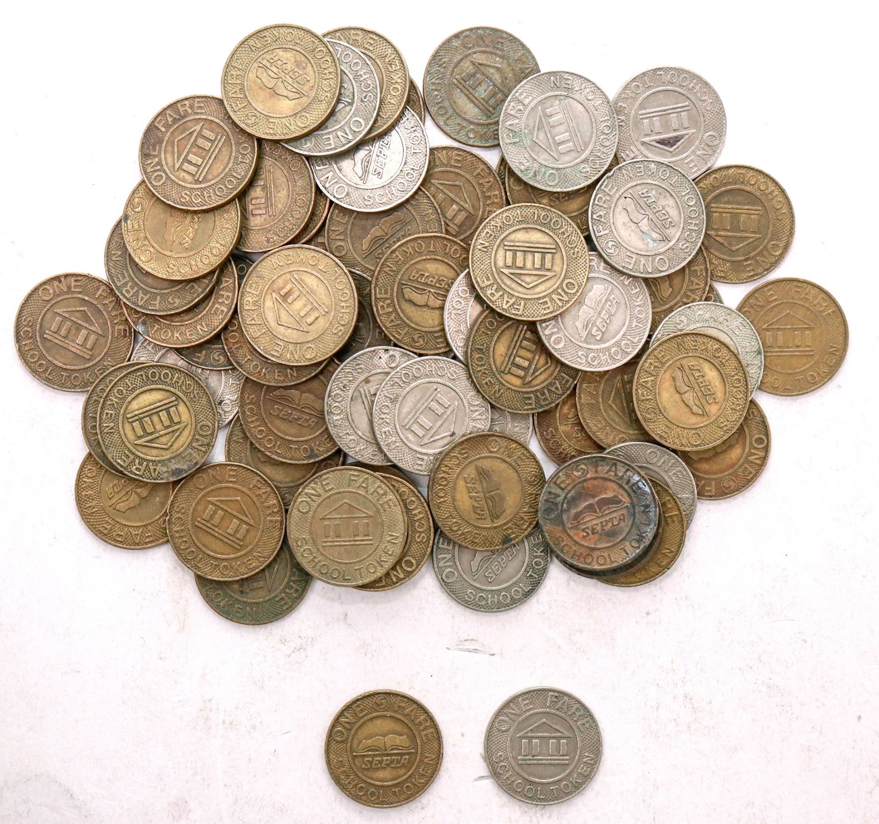 Southeastern Pennsylvania Transportation Authority transit fare school tokens. A few of the coins are darkened, discolored, or specked with rust, though the majority are in fair condition with minimal wear; see photo.