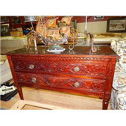 INTRICATELY CARVED SIDEBOARD/WRITING DESK - MAHOGY WITH GLASS TOP