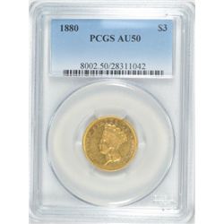 1880 $3.00 GOLD, PCGS AU-50, VERY VERY RARE, ONLY ONE CERTIFIED BY PCGS!!