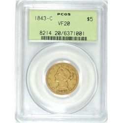 1843-C $5.00 GOLD, PCGS VF-20 GREEN LABEL, SUPER RARE, LOW MINTAGE! GREAT COIN