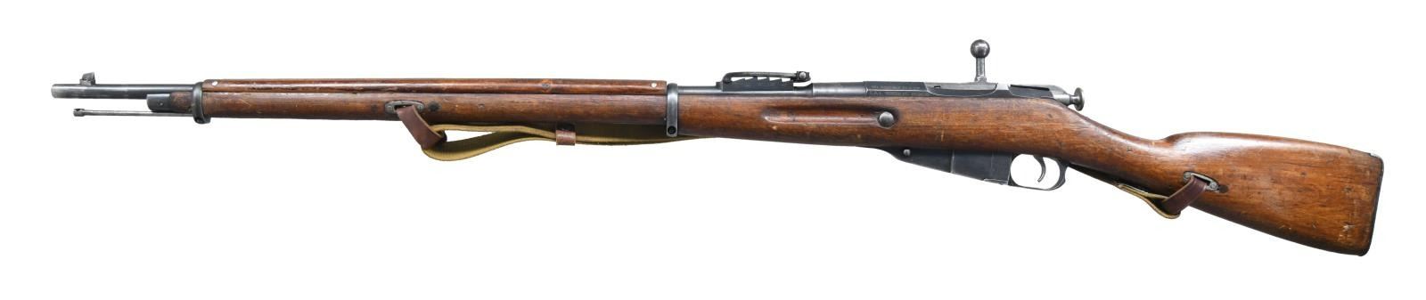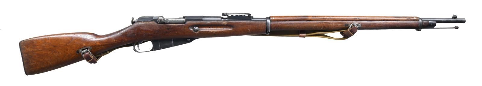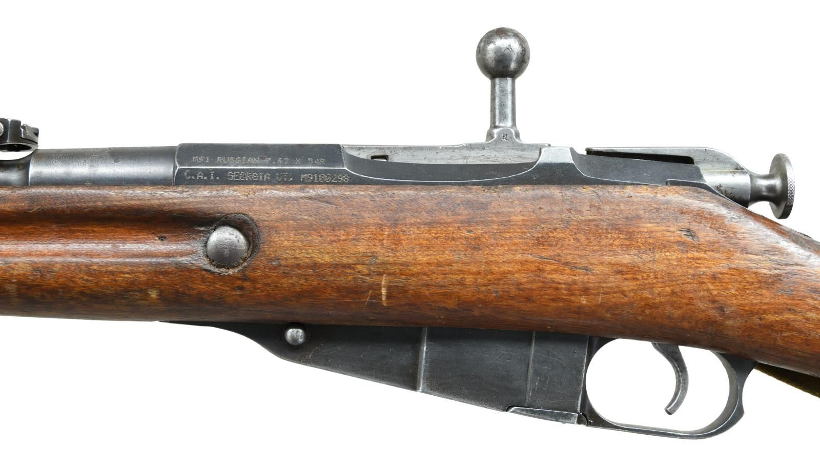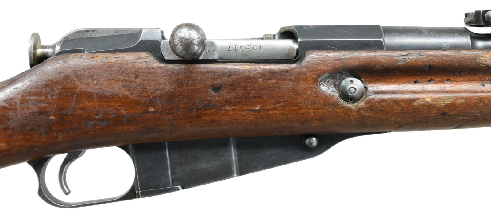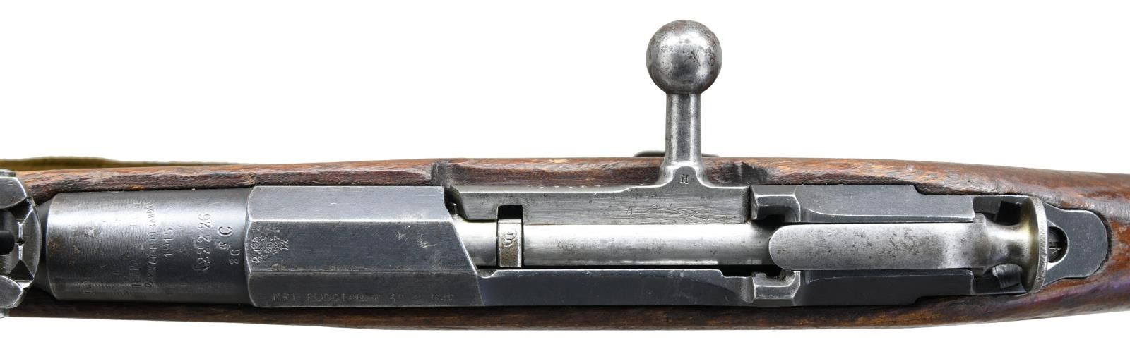 Cal. 7.62x54R. S# M9100298. Bbl. 31 1/2". Balkan reworked rifle. Matching numbers on buttplate & floorplate. Mismatched bolt. Bbl. top has scrubbed Czarist eagle, Tula arsenal markings, 1915 date & Serbian "C" marking. Top of receiver has peened Czarist eagle. Left side of receiver has import markings & importer added serial number. Ladder rear sight graduated to 3200 Arshins. Blade front sight. Hardwood stock set w/ sling slots & canvas Com-Bloc style sling. Cleaning rod present. CONDITION: stock set has arsenal reworked finish w/ a couple small plug repairs, a couple thin handguard cracks, scattered flaking, dings & handling marks. Metal retains 50% arsenal rework blue w/ overall thinning, scattered light oxidation & silvering. Fair bore w/ scattered pitting & oxidation. (23-1939/MJC). CURIO. $200-400.