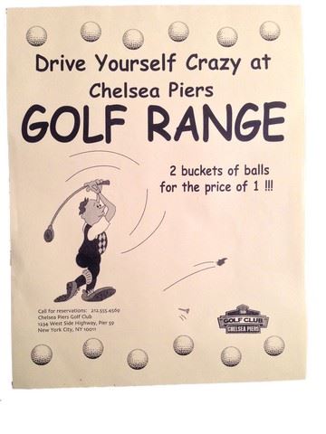 SERENDIPITY - Set of 5 Yellow “Golf Range” Flyers - A valuable collectors' set containing five 8 1/2” x 11” flyers printed in black lettering on pale yellow paper. The flyers attempt to get you to “Drive Yourself Crazy at Chelsea Piers GOLF RANGE” and offers the special promotion of “Two buckets of balls for the price of one.” There is a graphic of a man swinging a golf club on the left side, and a business logo in the bottom right corner. Frame this priceless set of custom MIRAMAX props in your authentic collection!!