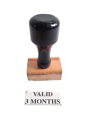 SERENDIPITY - Black-Handled Wooden Stamper - A vintage-style wooden hand-stamper with a black plastic handle and a rubber bottom that stamps “Valid 3 Months” when covered in ink. The 1 1/2” x 3” stamper is slightly dirty on the white label, which also reads “Valid 3 Months” in black ink. A priceless piece of authentic MIRAMAX movie magic with tremendous vintage appeal!!