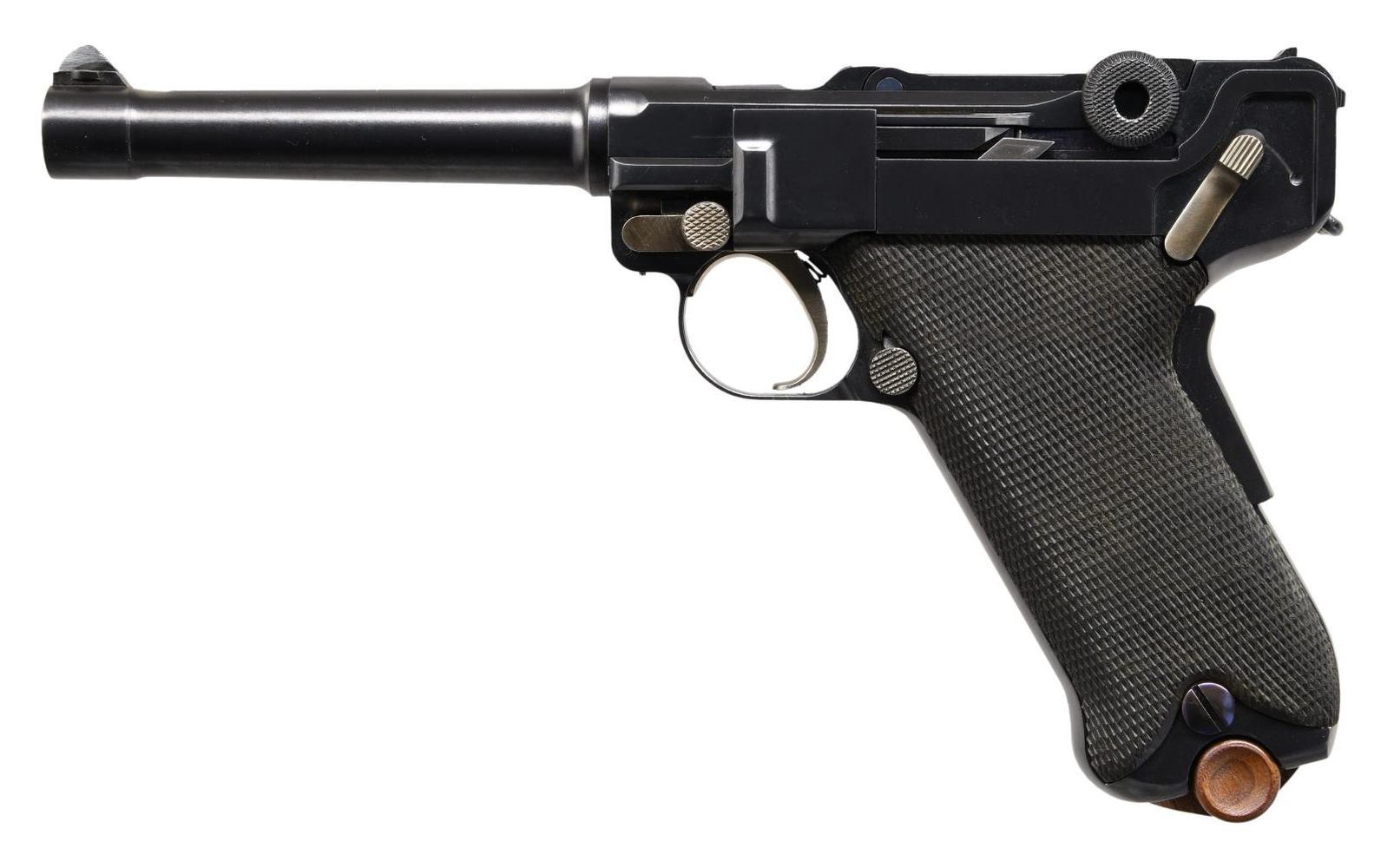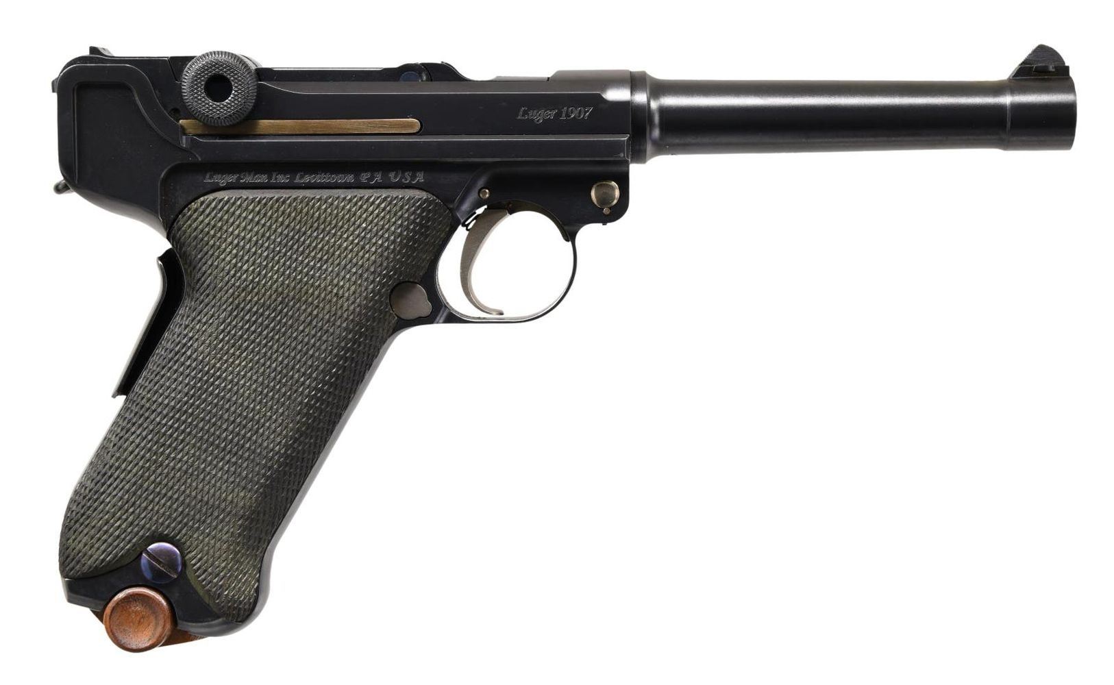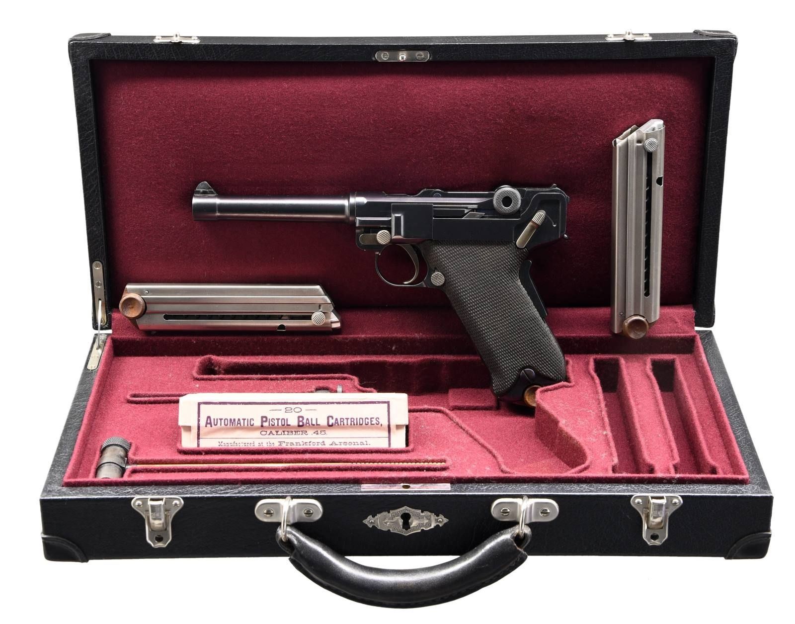 .45 ACP SEMI-AUTOMATIC PISTOL WITH CASE & ACCESSORIES. Cal. 45 ACP. S# 45. Bbl. 4 7/8". Model 1907 Luger (modeled after the U.S. Military 1907 Test Trials .45 ACP Luger) mfg. by Luger Man (Eugene Golubstov) of Levittown, PA. The left side of the frame is engraved "Luger Man Inc Levittown PA USA", with "Luger 1907" engraved on the right side of the bbl. extension. Underside of the bbl. is marked with the cal. designation ".45 AUTO". Left side of extractor/loaded chamber indicator is marked "LOADED". Major metal components including the frame, grip safety, bbl., bbl. extension, and the toggle train exhibit a blue finish overall, with some smaller components including the takedown lever, trigger, safety lever, and ejector exhibiting a straw finish. Frame is mounted with 2-piece checkered wood grips. Standard Luger pattern serrated blade front sight with V-notch rear sight. All serialized parts are matching in DWM's original commercial style, and include the frame, takedown lever, sideplate, trigger, grip safety, bbl., bbl. extension (on lug), breechblock, firing pin, as well as the toggle links. MAGS: 3 wood bottom 7-rd. mags. UNATTACHED ACCESSORIES: custom black leatherette transit/display case, featuring a red felt interior and containing 2 spare mags., 1 takedown / loading tool, an (empty) reproduction display box of .45 ACP ammunition, as well as a cleaning rod / oiler. CONDITION: near new, with metal components retaining virtually all of their original blue finish overall. Mirror bore, exhibiting grease, and well defined rifling throughout. Grips are excellent overall. Case is excellent, showing little superficial exterior wear from handling and storage. A near new and very attractive Model 1907 Luger mfg. by Luger Man, with a S# matching to this distinct variations caliber. PROVENANCE: The Collection of Edward Scott Meadows. (24-710/MLW). MODERN. $6,000-8,000.