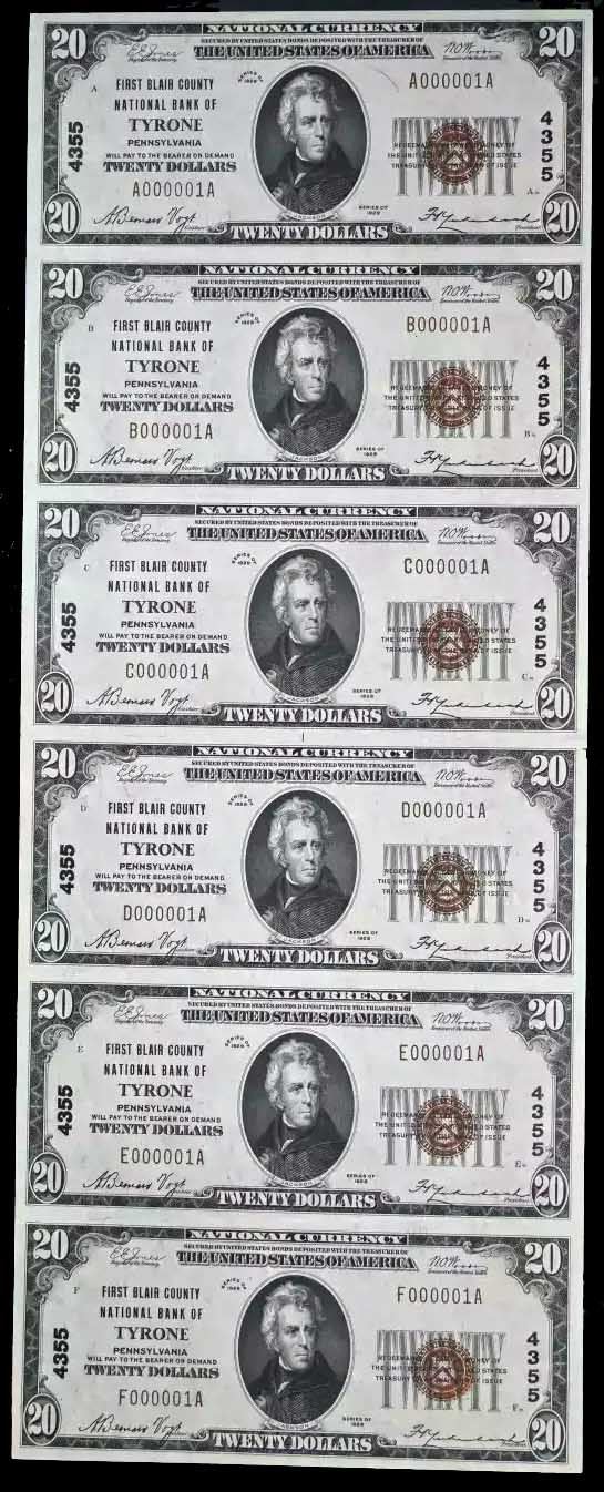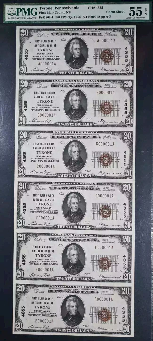 SERIAL NUMBER ONE UNCUT SHEET USA; Uncut Sheet 1929 $20 #000001A - CH#4355 - "Tyrone, Pennsylvania" Fr# 1802-1 PMG Choice About Uncirculated-55EPQ. A superb and very attractive "Uncut Sheet" of 6 notes with serial number 000001. A cool item.