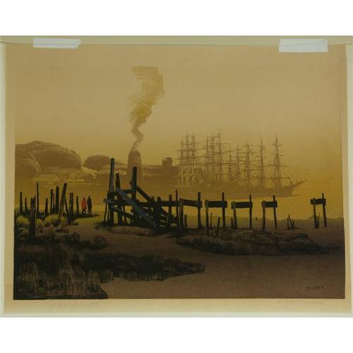 SERIGRAPH, Elton Bennett (1910-1974), WA. ''The Sawdust Empire''. Signed and titled lower section. Adhered to matboard; Unframed. 19'' x 25''/ 24'' x 29'' w/matboard.