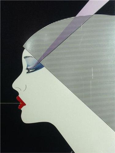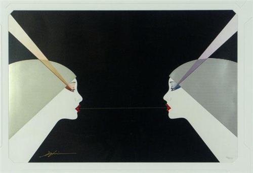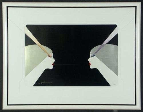 SERIGRAPH 17 3/4'' x 26 5/8'', Hisashi Otsuka. Image from the 80's: Two women connected by a thin silver line. Signed lower right. Numbered 54/3000. Placed in a white & black composition frame with custom double matting.