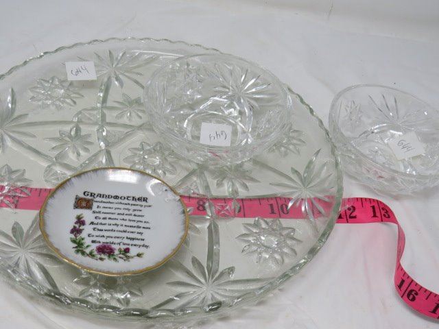 SERVING PLATE (LARGE, GLASS), 2 MATCHING SMALL FRUIT DISHES, SMALL PLATE (GRANDMOTHER VERSE)