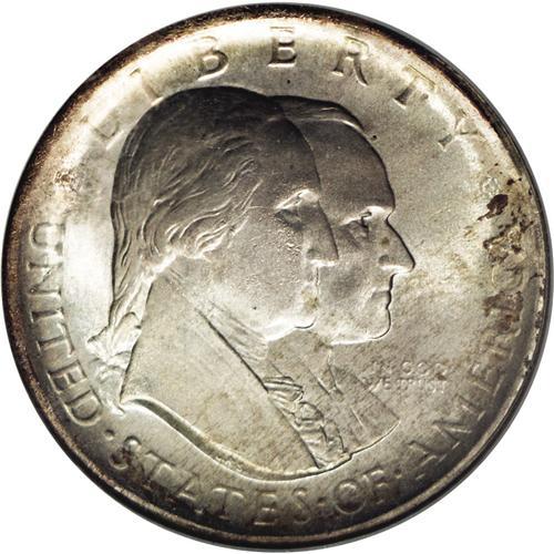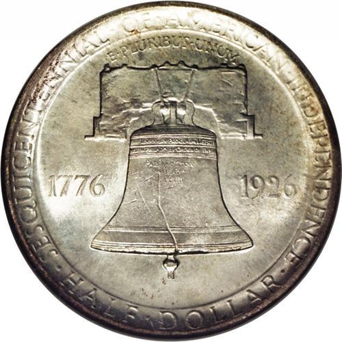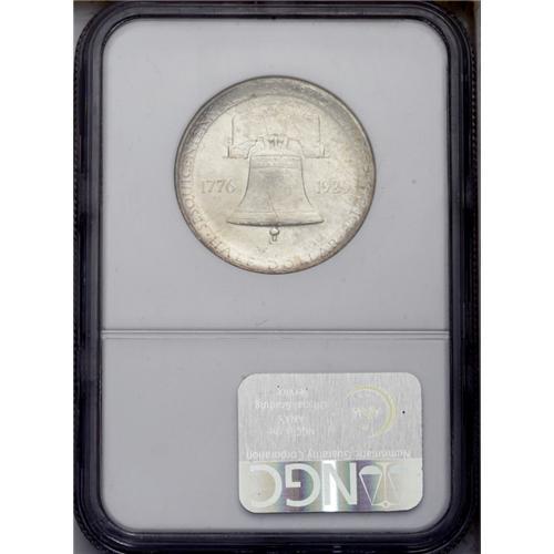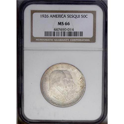 <B>Sesquicentennial<50C> MS66 NGC.</B></I> To observe the 150th anniversary of American independence, Congress approved a resolution to coin not more than one million silver half dollars and not more than 200,000 gold quarter eagles. John Sinnock, Chief Engraver at the Mint, was named to create designs for the commemoratives. His proposal for the half dollar was found to be unsatisfactory to the National Sesquicentennial Exhibition Association, however. Design ideas in the form of sketches submitted by attorney John Frederick Lewis, a prominent patron of the arts, were accepted and used instead.<BR> The obverse depicts the conjoined portraits of presidents Washington and Coolidge, who happened to be president when the coin was issued. Objections against the use of a living person on current coinage went unheeded. The reverse shows the Liberty Bell. At the insistence of the Association, the designs were executed in very shallow relief, with the result that the coins struck up poorly.<BR> The Premium Gem example offered here displays lustrous surfaces covered in a veneer of light tan and powder-blue patina, joined by pastel rose on the obverse. The design elements exhibit nice detail throughout. A few trivial marks on Washington's cheek and on the bell do not distract from the coin's overall eye appeal. Neither NGC nor PCGS has certified any examples finer (3/06).<BR><I>From The David L. Goodwin Collection.</B></I> <BR><BR><B>Important notice:</B> Heritage usually auctions material at the rate of 200-250 lots per hour. On some occasions eBay Live bid software or the Internet may not be able to keep up with the pace of the auction. We recommend placing a realistic absentee bid now as insurance to avoid disappointment. Occasionally the auctioneer may eliminate or reject an eBay Live bid, and the auctioneer may also reopen a lot after the close of the eBay live bidding (usually because we missed an audience bid), and may reject your bid even if it shows you as the winning bidder. By bidding via eBay Live, you agree that Heritage may award the lot to another bidder at its sole discretion under the circumstances described above or any other reasonable circumstances. Since eBay bids are not shown to us until we open the lot on the floor, we treat those bids just like floor bids. In most cases the floor responds before the eBay bid is presented to us, due to Internet lag time, so for consistency we have made it a policy that floor bids are always considered first over tie eBay live bids. Also please note that all Heritage lots purchased through eBay Live carry a 20% Buyer's Premium. Please make sure you read the Terms and Conditions before you bid. This lot is being auctioned in conjunction with a live floor auction by Heritage Galleries & Auctioneers. All final auction and invoice information will be supplied by Heritage Galleries & Auctioneers, and all other information should be considered preliminary. Lot:5080 <BR><BR><B>Winning Notification and Billing:</B> After the FINAL session in this auction is complete, Heritage will send e-mail and snail mail invoices. This process normally takes several days. All final auction and invoice information will be supplied by Heritage Galleries & Auctioneers, and all other information should be considered preliminary. <BR><BR>This auction will be conducted on a live auction floor and over the Internet through eBay Live. If you choose to place an absentee bid, please take a moment to <font color='#0000ff'><u><a href='http://pages.ebay.com/liveauctions/help/before/laabsentee.html'>learn how eBay Live absentee bidding works</a></u></font><font color='#000000'>