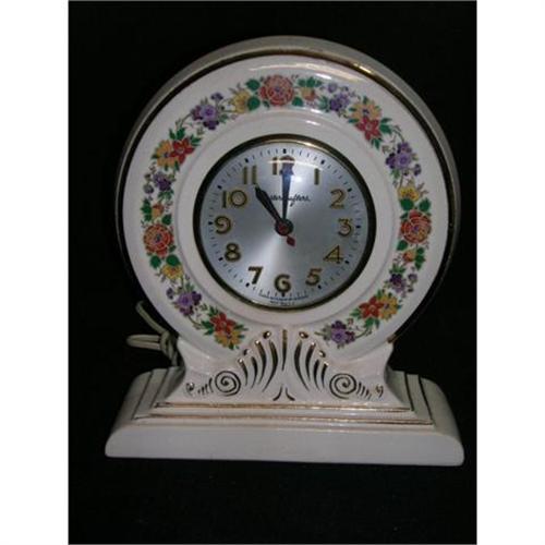 This is a beautiful electric china/pottery clock made by Mastercrafters. The movement is made by Sessions Clock Co. I am not sure where the Mastercrafters company was located but most likely in the USA. This nice mantle or shelf clock is 10" tall and 8-1/2" wide at the base by 3" deep. There is gold decoration that is worn in some places but very clear in others. There is transfer floral decoration around the face of the clock that is in full color. The clock face is 4" in diameter and covered with glass. On the back metal plate there are markings with US Patent numbers and the notation that this is Model # W. There is some crazing in the glaze but it is in wonderful working condition. There is a knob missing on the back but the knob that works the hands is intact and works. There are no chips, flakes or cracks in the china body.