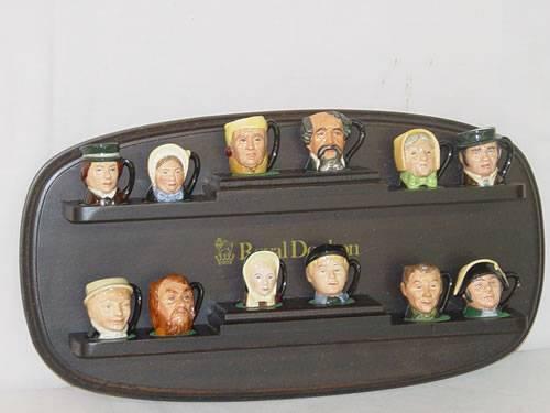 SET (12) ROYAL DOULTON MINIATURE TOBYS OF DICKENS CHARACTERS and HANGING WALL SHELF W/ ORIGINAL PACKING BOXES;