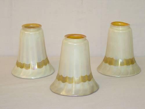 SET (3) 5 1/4" PEARL LUSTRE W/ GOLD SHADES, UNSIGNED (PROBABLY QUEZAL) - 2 1/8" FITTING;