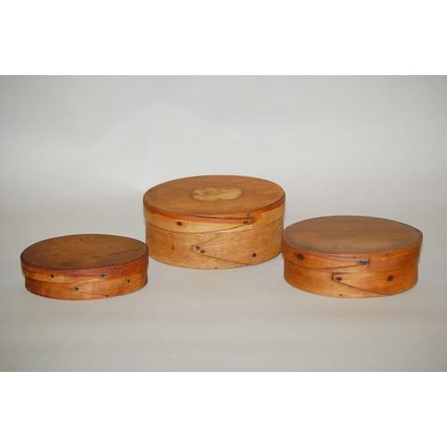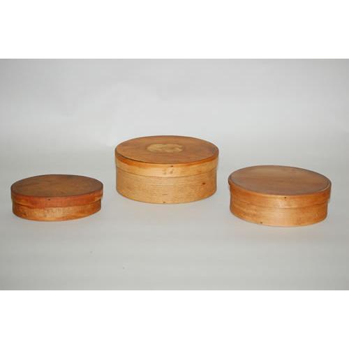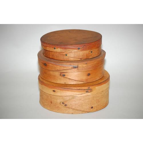 SET (3) OVAL PANTRY BOXES - (3) GRADUATED OVAL FINGER BANDED PANTRY BOXES W/ SINGLE SHAPED WOODEN FINGER BANDS ON BASE & LIDS IN NATURAL FINISH (PROB. HARVARD MA BOXES; 6 1/8" X 2 1/2", 5 3/4" X 2" & 5 1/8" X 1 1/2")-WEAR, STAIN, IMPERFECTIONS