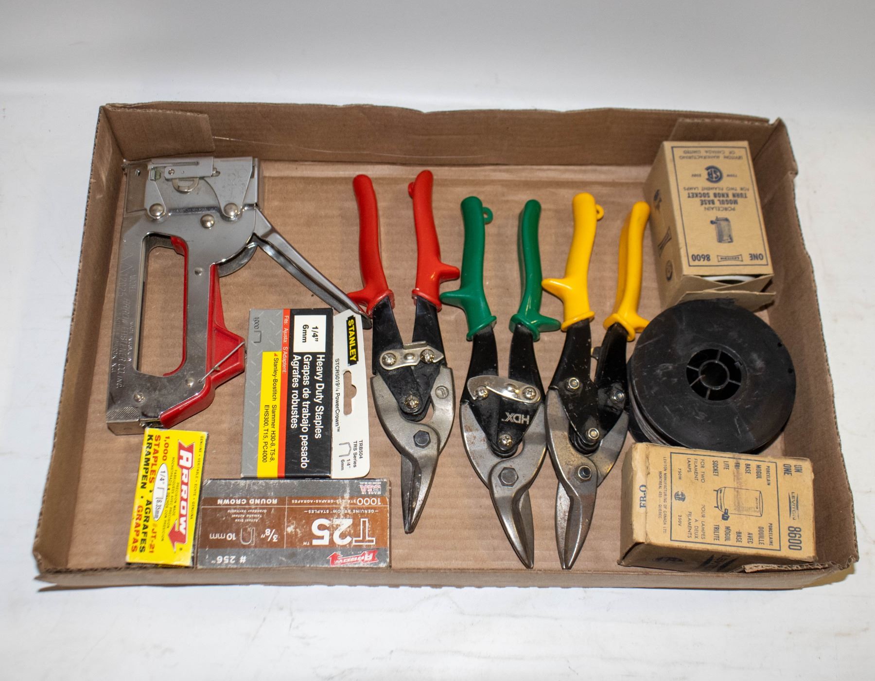 SET 3 TIN SNIPS, STAPLER, ROLL OF TY WIRE