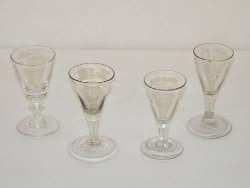 SET (4) 4 3/8" 18TH CENT. CLEAR ENGLISH WINE FLUTES W/ ROLLED FOOTED RIM - RIM NICKS VARIOUS SIZES;
