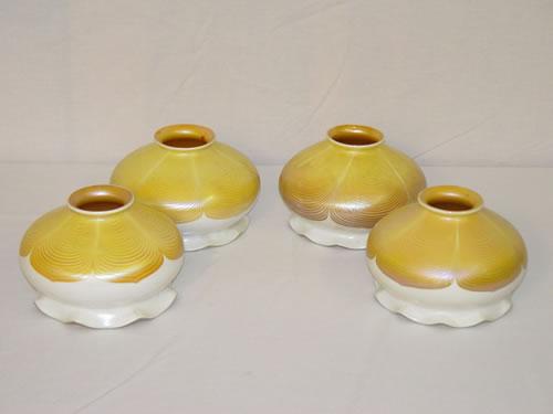 SET (4) 5 1/2" QUEZAL GOLD IRIDESCENT SHADES W/ PULLED FEATHER DECORATIONS, UNSIGNED