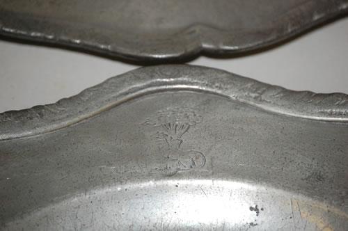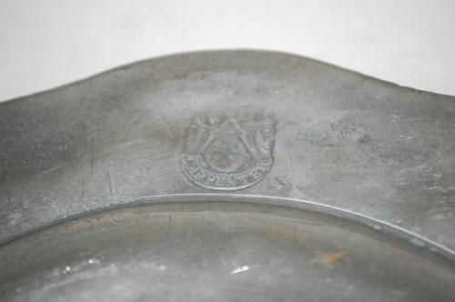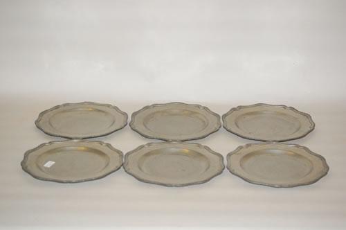 SET (6) 18TH CENT. ENGLISH PEWTER PLATES - SET (6) 9 3/4" ENGLISH PEWTER PLATES W/ 5 LOBE BORDER & CREST & 18TH CENT. JOHN CARPENTER LONDON HALLMARK - WEAR & IMPERFECTIONS