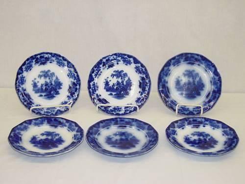 SET (6) 8 1/4" FLOW BLUE PLATES - SCINDE PATTERN BY ALCOCK - SCRATCHES;