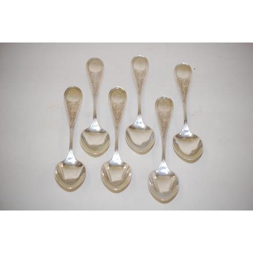 SET (6) KNOWLES SILVER TEASPOONS - SET (6) J.B. & S.M. KNOWLES CO. STERLING TEASPOONS W/ CORONET PATTERN AESTHETIC MOVEMENT DECORATION-DATED 1882 (5 TROY OZ.)- WEAR & IMPERFECTIONS