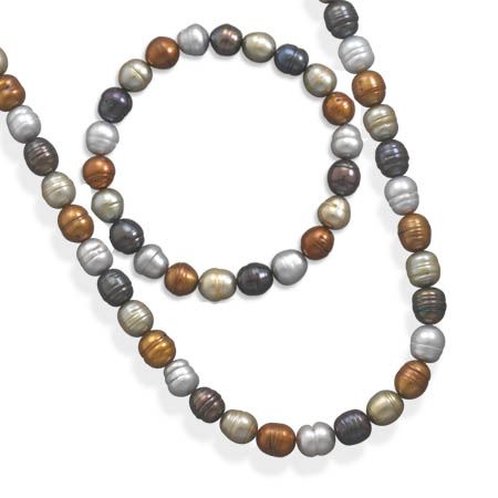 18" + 2" extension bronze, olive, peacock and silver color cultured freshwater pearl necklace and stretch bracelet set. The cultured freshwater pearls are approximately 8mm x 9mm. The necklace has a lobster clasp closure. .925 Sterling Silver