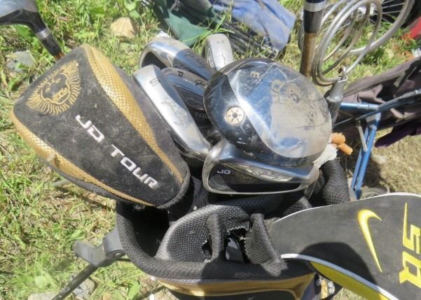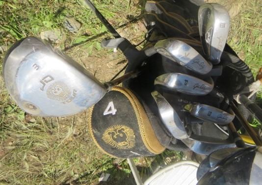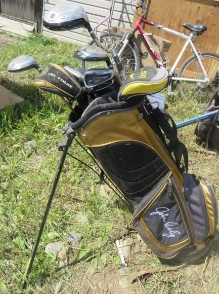 SET OF 10 GOLF CLUBS (BAG HAS BUILT IN STAND, BLACK AND GOLD) *JOHN DALY* (MISC GOLF SUPPLIES IN BAG INCLUDED)