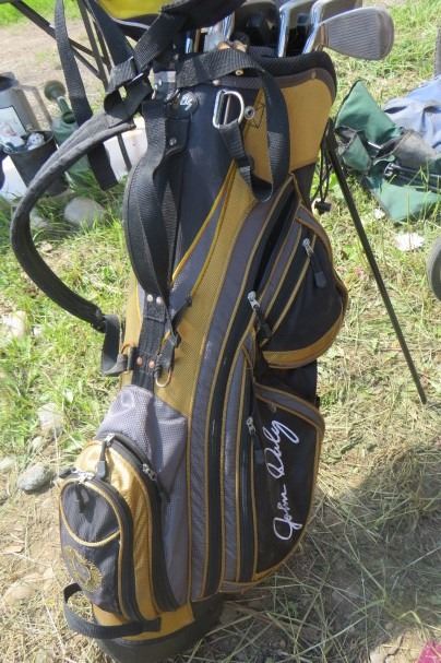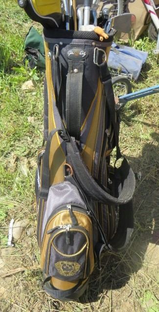 SET OF 10 GOLF CLUBS (BAG HAS BUILT IN STAND, BLACK AND GOLD) *JOHN DALY* (MISC GOLF SUPPLIES IN BAG