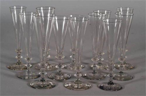 SET OF 12 ANTIQUE GLASS FLUTES 18th century ranging from 6 1/4" to 7 1/2", CONDITION: two with base chips, one flute probably of later date. PACKING AND SHIPPING BY FAIRFIELD AUCTION WITHIN CONTINENTAL USA (excluding insurance) $35,
