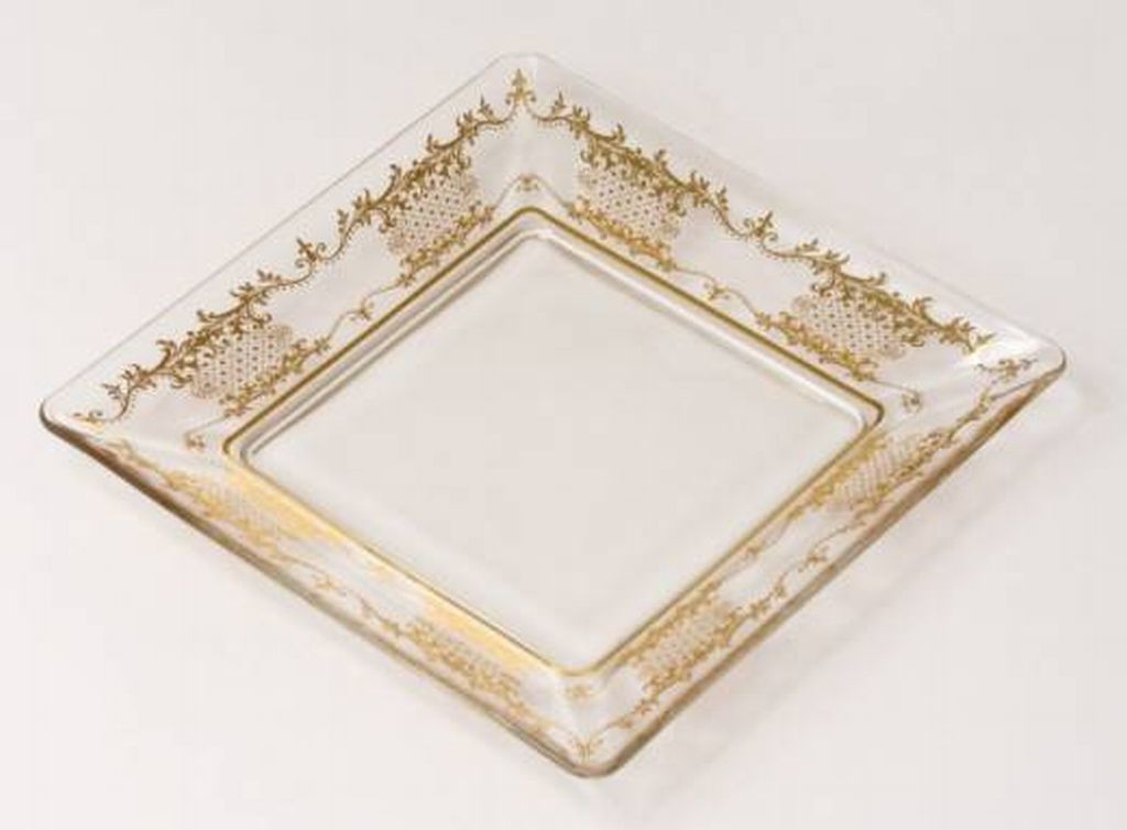 ITALIAN LEAD CRYSTAL SQUARE PLATES - VENETIAN HAND PAINTED 14 KT GOLD ARTWORK - SET OF 12 PLATES - 6"